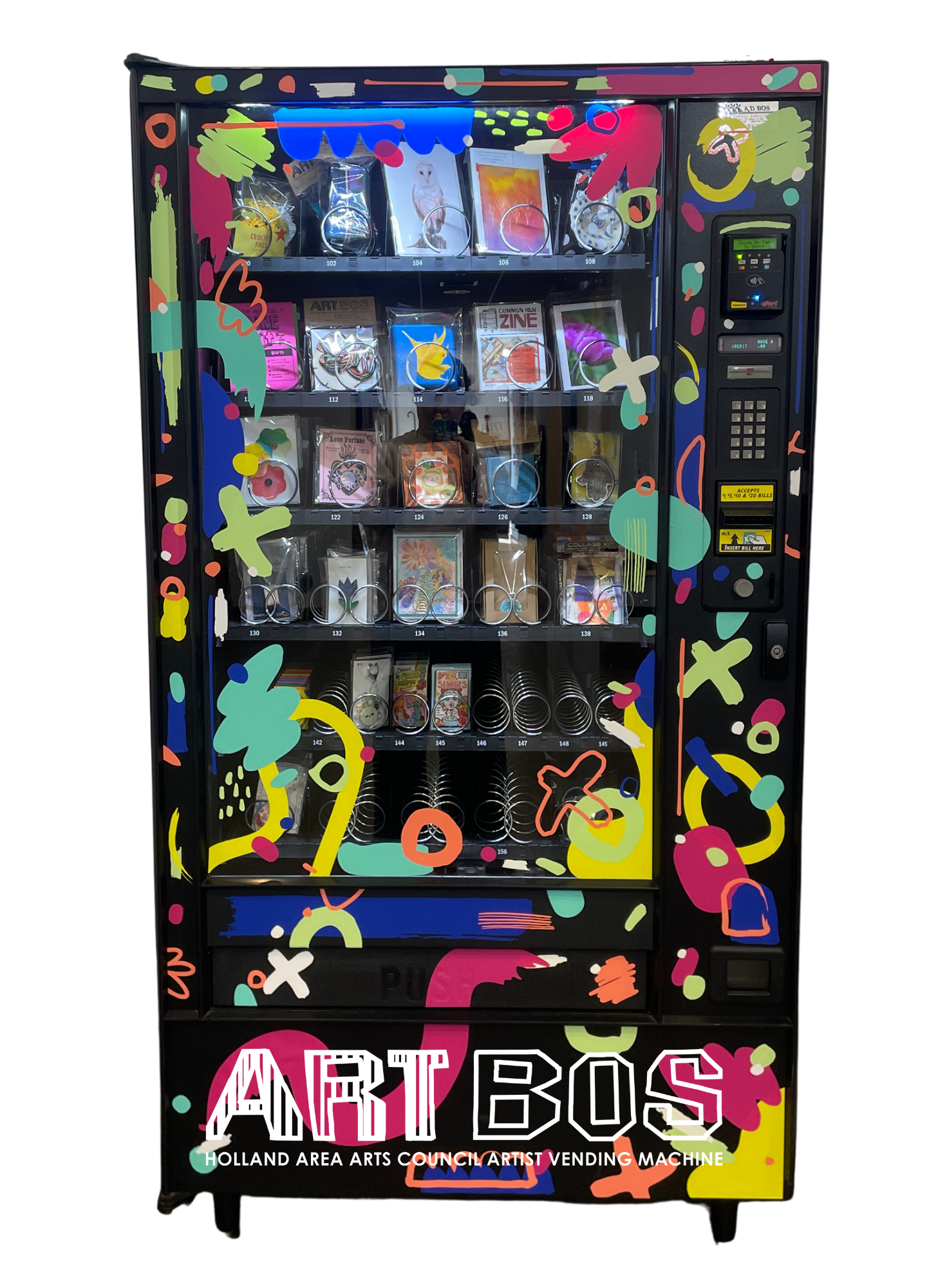 The Holland Area Arts Council is pleased to announce the launch of our very own art vending machine! Thank you to BOSS Vending Machines for helping us create this amazing opportunity to local artists. This Vending machine will include stickers, jewelry, HAAC Swag, pins, buttons, miniatures, prints, small paintings, and so much more! This gives artists an exciting opportunity to share their works in a no-pressure way! If you are an artist looking to display your works, please use the Link below and fill out a submission form. Submissions will be reviewed monthly. If your work is selected, you will be contacted with further details regarding consignment and drop-off. More information about submissions on the form.