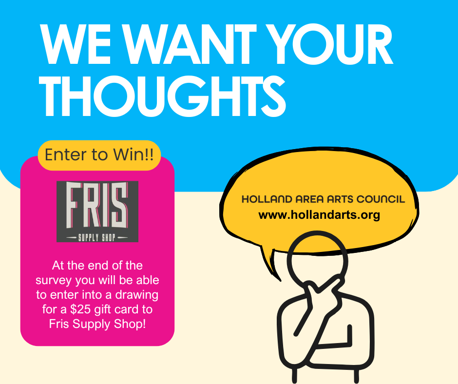 We are planning for the future of the Holland Area Arts Council and we want to hear from you! Take our community survey and share a bit about your experiences and hopes for the arts in Holland.
